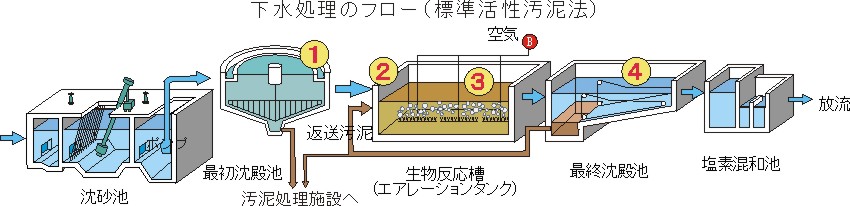 下水処理場の図解(標準活性汚泥法) |