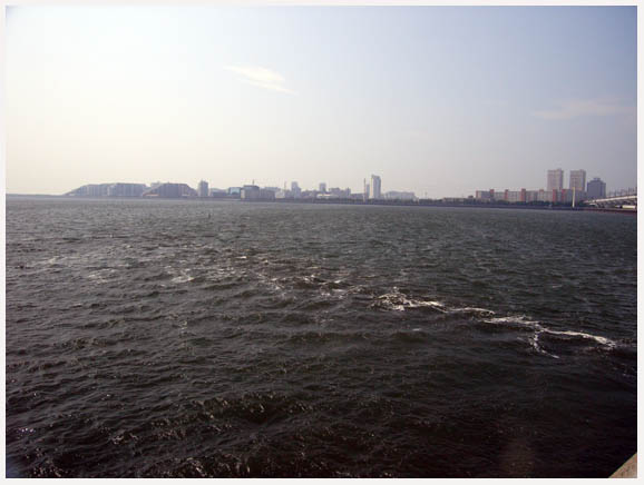 埋め立てにより2.5km突き出ています。マンション街に。その向こうはデイズニーランド。こちら側が三番瀬。白い泡は宮内庁鴨場からの、引き潮流れ。