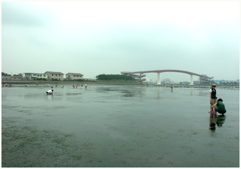 | 盤州干潟見学会 2006/8/12 活き活き東京湾研究会 NPO21世紀水倶楽部 干潟見学会も3回目になります。今回も大野さんのお世話になりました。 お盆休みにぶつかり船が借りられなかったため、小櫃川河口など干潟の中心に行くことができず、一番南の潮干狩りの区域だけになりました。潮干狩りのシーズンも終わりで、翌日の日曜日が最後だったのでアサリも期待していませんでした。ところが行ってびっくり、岸から沖まで大量に生息していました。岸の方は比較的小さく沖の方は大きいようでしたが食べられる十分な大きさでした。貝掘りに集中すれば一時間くらいで制限の2kgがとれる程度。これまでの干潟見学会ではアサリの姿をあまり見ることがありませんでした。船橋海浜で稚貝が一部密集していた程度。今回の木更津ではアサリばかりでバカ貝もシオフキも殆どいませんでした。 |