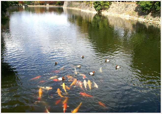 水鳥と鯉がパンに集まってきたところ。