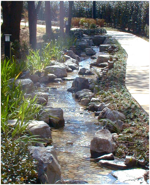 雨水排水路を地下構造にして地上部に設置されたせせらぎ水路を。せせらぎは2系統