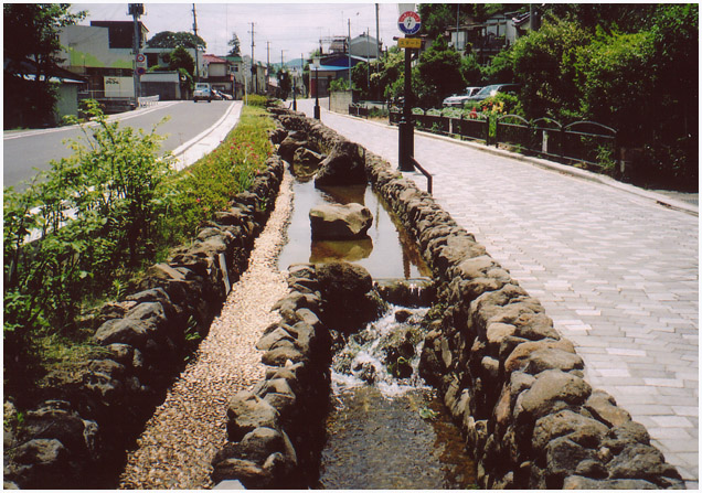 下水道の雨水排水路を地下に入れて上部にせせらぎを設置。 一本のせせらぎ水路が4区分され設計整備されています。下流から、水辺の散歩道、水と歴史の小道、水と花と緑の公園、せせらぎの散歩道