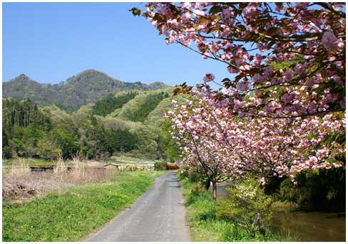 駅からの道から少しそれたところ。遅咲きの八重と山の新緑が。
