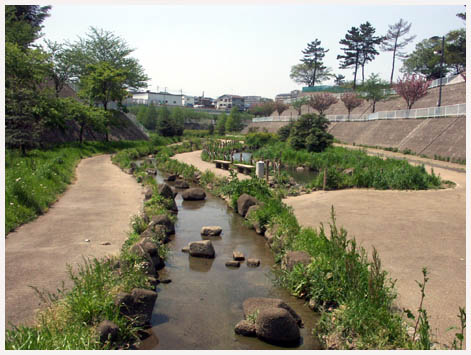 調整池の最上流付近から、親水テラス付近まで、上流から流れてきた水の一部を流す、せせらぎが。