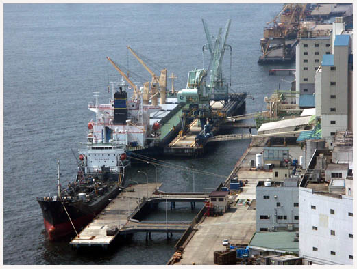 公園は港湾施設に取り囲まれています。渚の北の水路のむこう。けっこう大きな船が