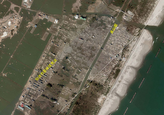 ざっと見て300戸あったのでしょうか。殆どの家が跡形もなくなっています。ここから仙台東部道路まで2km。ただ地区の北にある学校と、近くの石油スタンド、南にある老人ホームの躯体は残っています。引き波によって、貞山堀を越えて水路が掘られてしまいました。