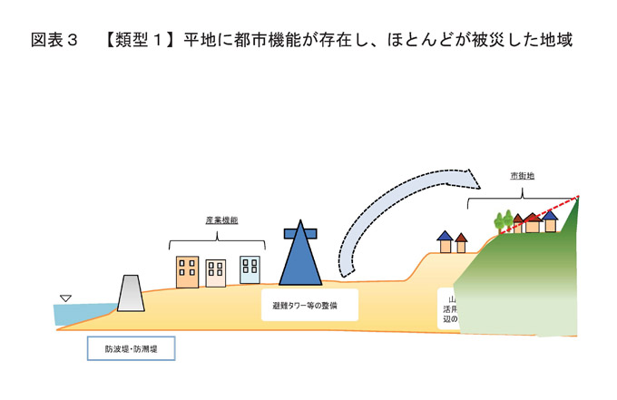 | 大津波被災地域での緊急対策案 「復興への提言」図表からの抜粋 東日本大震災復興構想会議 2011.6.25 地域を類型化して、復興の施策を示している。下は類型1のプランですが、他の類型もほぼ同じで、 このように記述されています。 「原則的には、高台移転を目標とすべきであるが、適地確保の問題、水産業など産業活動の必要から、平地の活用も避けられない。その際は、大規模津波発生時には被災の可能性があることから、できるだけ地域になくてはならない産業機能などのみの立地とする土地利用・建築規制を一体的に実施せねばならない。土地のかさ上げ、適切な避難計画に基づく避難路の整備・機能向上、避難ビル等の整備についても積極的な検討が必要である。」 |
