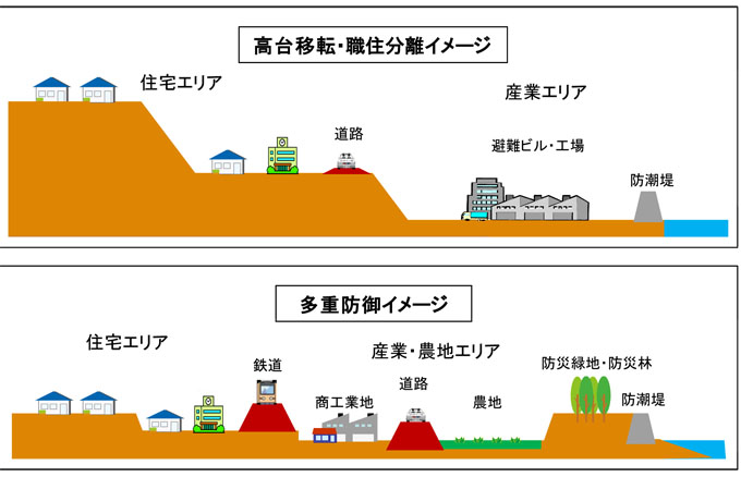 | 大津波被災地域での緊急対策案 宮城県震災復興計画案から 宮城県 平成23年8月 P11復興のポイント ○高台移転,職住分離 ・ 住宅をはじめ,行政庁舎,学校,病院などの施設を高台に移転するとともに,水産業や観光業などが主要産業である沿岸部については,地域の状況に応じて職住分離を図り,居住空間の安全を確保します。 ○多重防御による大津波対策 ・ 幹線道路や鉄道などの交通インフラを高盛土構造とし,堤防機能を付与するとともに,防潮堤の背後に防災緑地・防災林を設けるなど,多重防御による大津波対策を推進します。 ○安全な避難場所と避難経路の確保 ・ 津波避難ビル,避難タワーの建設や学校の防災機能の充実・強化などにより,安全な避難場所と避難経路を確保します。また,観光客などのビジターも含め,適切に避難誘導できる体制を構築します。 |